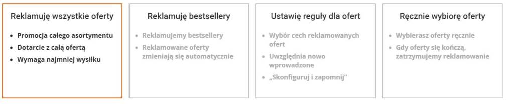1. Przygotowywanie różnych typów emisji: Poza tym, że możesz robić spoty, które wyświetlą się w obrębie marketplace’u, Allegro umożliwia połączenie kampanii z Google Ads oraz Facebook Ads, co zdecydowanie ma wpływ na dotarcie do jeszcze większej grupy potencjalnych klientów. O ile w opcji Google chodzi o wyświetlanie produktów na stronie wyszukiwania, tak w przypadku Facebook’a działa remarketing Allegro, czyli w mediach społecznościowych wyświetlają się niedawno oglądane produkty z platformy sprzedażowej.
